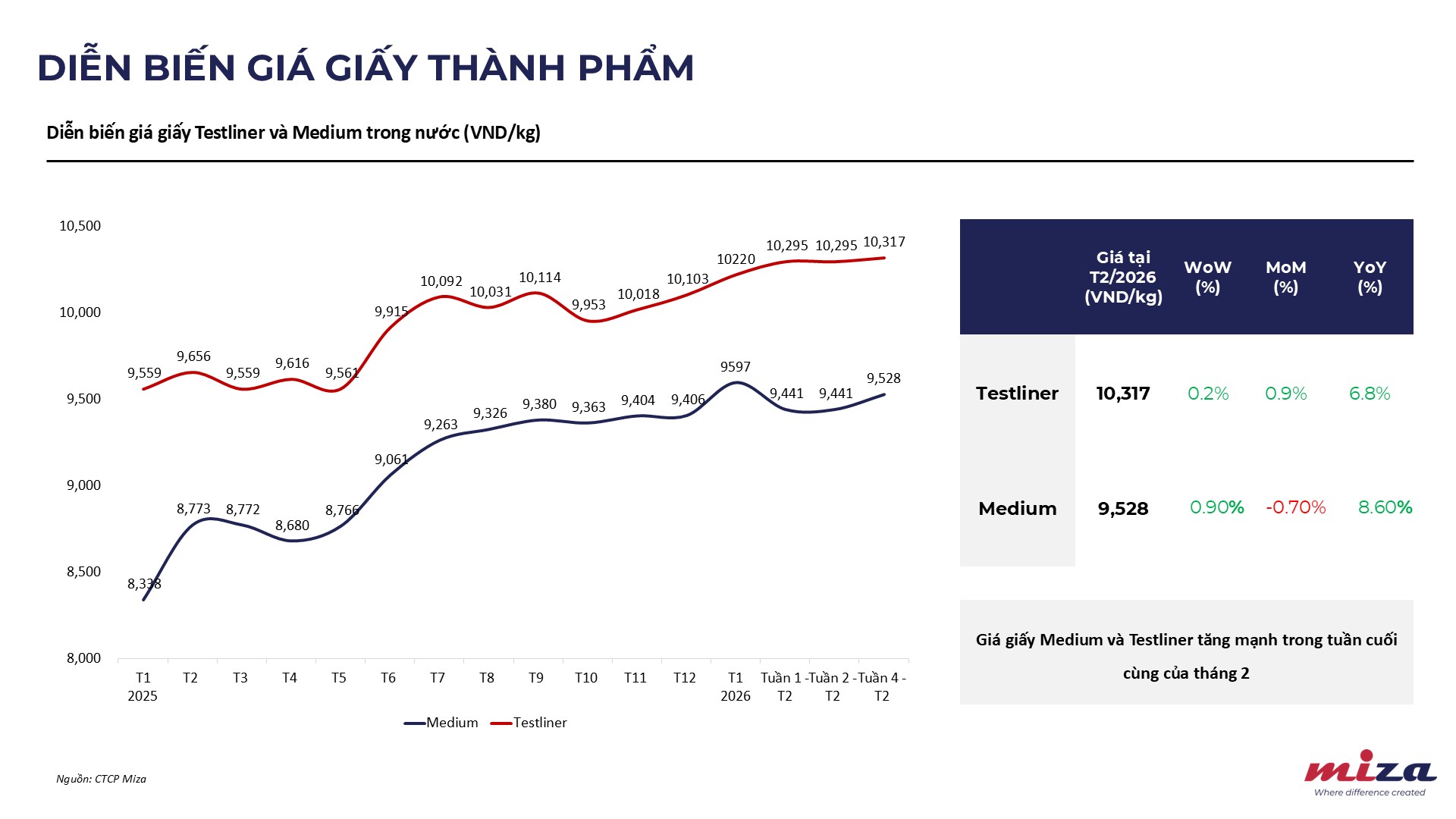 • Testliner: Đạt mức 10.317 VND/kg, tăng 0,9% so với tháng trước và tăng 6,8% so với cùng kỳ năm ngoái (YoY).