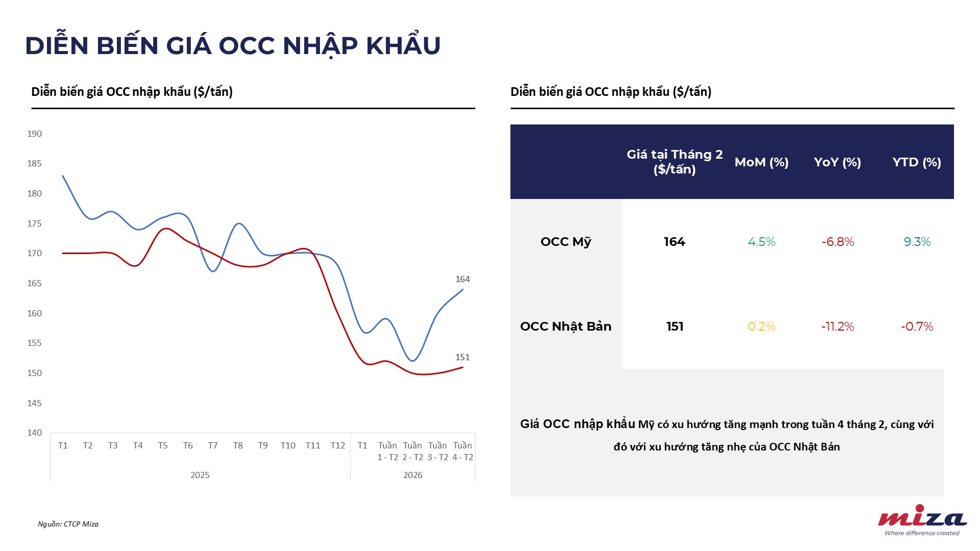 • OCC Mỹ: Đạt mức 164 $/tấn, tăng mạnh 4,5% so với tháng trước (MoM) và tăng 9,3% so với đầu năm (YTD). Xu hướng tăng đặc biệt rõ nét trong tuần 4 của tháng.